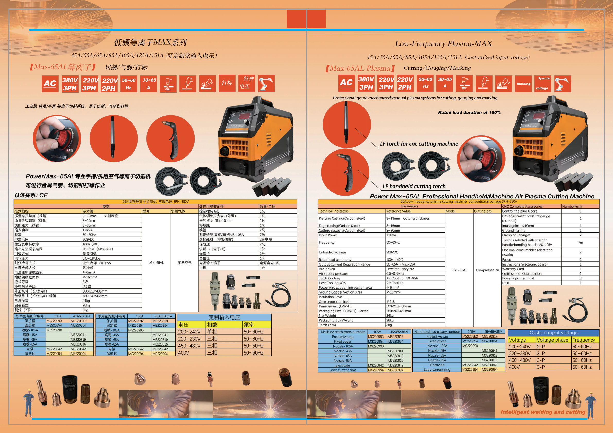 *Industrial level 100% (duty cycle )2PH-220v 3PH-220v/380v 50~60Hz plasma cutter